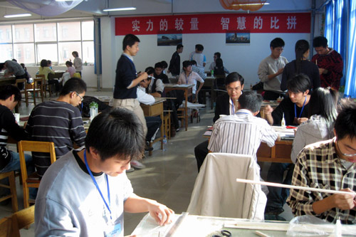 模型制作现场秩序井然,各队选手在制作台上或计算数据、或打磨材料、或进行粘合,四周墙壁挂有“实力的较量、智慧的比拼”、“认真遵守比赛规则、自觉维护会场秩序”等条幅,营造了良好的竞赛氛围。各位领导依次观摩了各所参赛学校的模型制作过程,并不时与参赛学生和指导老师热情交谈,询问在制作工具、材料、条件等方面还有什么需要,并对赛间生活加以慰问,各高校参赛师生对365完美提供的参赛服务表示满意。