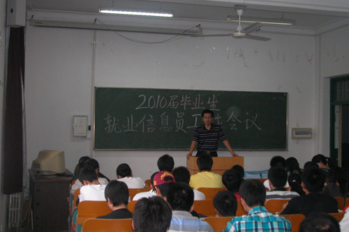 柳老师通报了我院就业信息员队伍体系建设情况。我院在总结往年就业工作经验和成果的基础上,不断加强和完善就业信息员队伍建设,成立了学院就业助理员、班级就业信息员和宿舍就业信息员三级就业信息服务体系。随后,柳老师对就业信息员的工作职责和下一步即将开展的工作作了具体布置,她号召全体就业信息员,齐心协力,为2010届毕业生圆满就业贡献自己的力量。