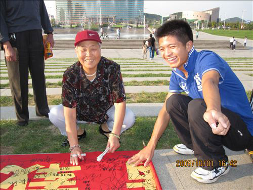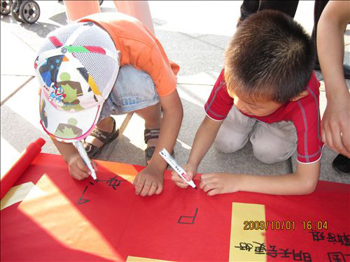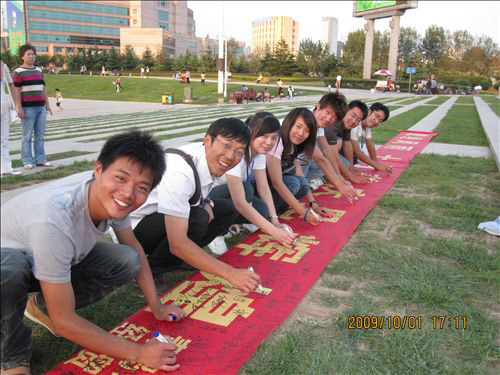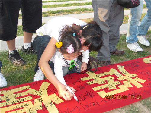 10月,炎黄子孙携手同庆的日子;10月,华夏儿女为之自豪的日子。在祖国母亲迎来她的第六十个生日之时,经贸学院学生会于10月1日下午携“六十满载经风雨 十月普庆见辉煌”长卷于区政府广场号召广大人民群众以签名祝福的方式为祖国母亲献礼。 活动开始,学生会工作人员代表经贸学院学生会向群众发放国旗。该环节吸引了许多中小学学生及家长们的关注,他们纷纷来到长卷前为祖国留下祝福。甚至有不会写字的小朋友也在我们的鼓励下画国旗、画花朵、画笑脸来表达他们对祖国母亲的一份热爱。 接下来的万人签名环节将本次活动推向了高潮。一位八十岁高龄的老艺术家在长卷上留下一副对联,赞颂祖国60年来的辉煌成就;还有一个母亲手把着两岁半儿子的手在长卷上签名预祝祖国的明天会更加美好! 最后,在同学们和群众朋友们的共同努力下,大家举起万人签名长卷,高呼“祖国万岁!中国加油!”来表达对祖国母亲的一颗赤诚之心。 本次活动以为祖国加油为旨,通过万人祝福长卷的形式,团结人民群众共同创建美满、安康的社会主义和谐社会,打造了365完美体育喜迎国庆系列活动的最强音!(经贸学院翟健彤王振)