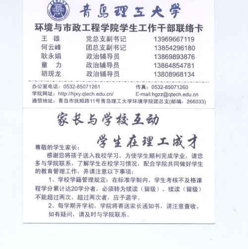 近年来,环境学院一直注重与学生家长的互动与沟通,积极探索“家庭—学校”互动的学生工作新模式,于2008年推出了“学生工作干部联络卡”,在新生入学报到时统一发放给学生及其家长,并提出了“家长与学校互动,学生在理工成才”的育人工作新思路,为学生家长及时了解学生情况,协助学校做好学生教育管理工作开辟了新的渠道。(环境学院)