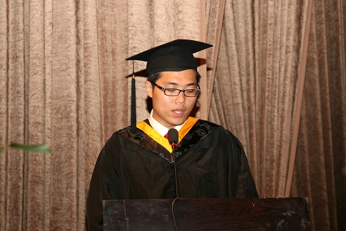 首先,环境学院建筑环境与设备工程053班学生王佳琳代表毕业生上台讲话,发言中,他表达了全体毕业生的心声,表达了对学校的深情厚谊和对老师辛勤培育的感激之情,并表示在今后的人生旅途中将继续弘扬母校的优良传统,努力工作,不断进取,为母校增光。