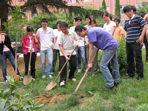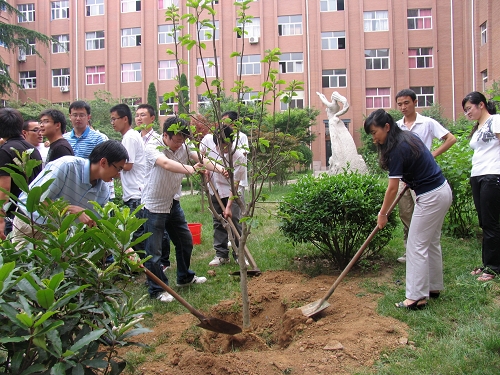 6月18日下午,植树活动在一号实验楼楼前正式举行。学生处处长沈文清,环境学院党总支副书记王雄以及给水排水专业05级三个班的全体同学参加了这次具有深刻意义的植树活动。