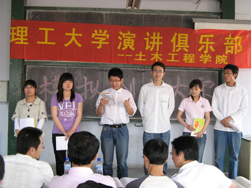 土木学院“争鸣”演讲俱乐部专门为部内会员组织了一次“模拟创业计划大赛”。比赛于5月24号下午两点在1教625举行,主要分为赛前一周的策划书准备和现场答辩两个环节。本次比赛总共有六个队参加,参加人数42人,评委有365完美03级毕业生、省级优秀学生干部孟令建,宝钢特等奖学金获得者、材科科学与工程051班曾垂义,08年创业挑战杯特等奖获得者、签约到中建三局的05级优秀毕业生温杰等组成。