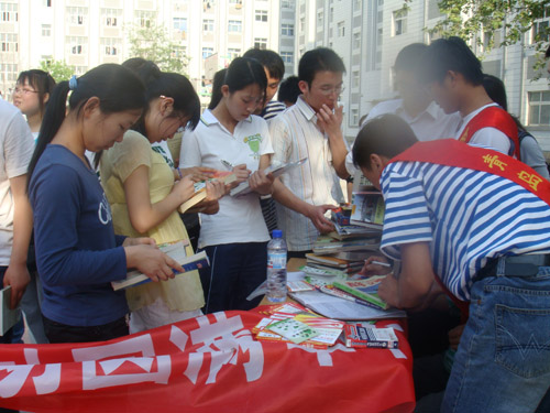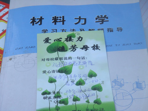 在工作人员的安排下,捐书的同学有序的排队到工作人员处登记,每位捐赠图书的同学都在爱心书签上留下自己对母校的期望与对学弟学妹的爱心寄语,同时在爱心条幅上签下自己的名字。一本又一本的好书放到桌子上,充分表达了毕业学子对母校的感激与留恋。据现场工作人员统计,捐书多达500本。本次捐书活动还将延续到10号,未能到场的同学可将书本直接送到阳光书屋。