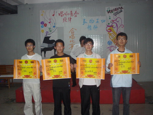 同学们个个精神饱满,豪情满怀,并整齐着装。比赛在08级4班的一首好听的《我们是朋友》中拉开帷幕,他们用歌声唱响心声,感动了每一位在场的观众,一开始就将比赛推向高潮。随后,各参赛队伍的一首首青春励志的歌曲,让我们真切的感受到同学们的满腔豪情。各代表队准备充分,实力相当,经过角逐,08通信2班凭借一首《众人划桨开大船》获得第一名。评委们秉着公平公正的原则为各代表队打分,分别评出一、二、三等奖及优秀奖。