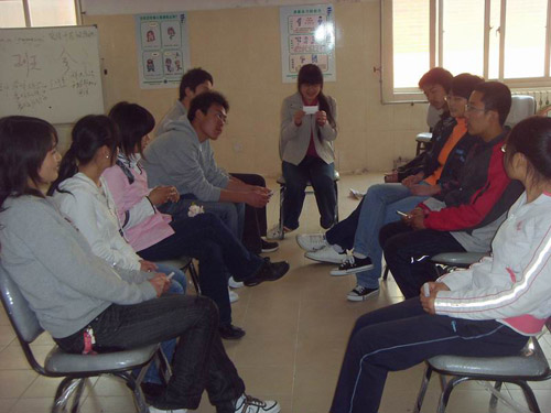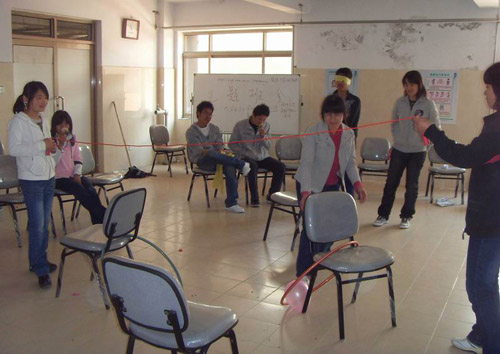 活动开始参与者在主持人的指挥下进行了简单的自我介绍。接着,活动进入第一个环节:“连连看”:此环节要求参与者要找到背上贴有于自己背上相同图案的伙伴,主要目的在于引导参与者学会向他人求助。活动第二环节:“向左转、向右转”:要求参与者听到主持人的命令后按口令转动,转错方向的同学要站出来大声说出:“对不起,我做错了”,此环节在于训练参与者承认错误的勇气。因为犯错并不可怕,可怕的是不愿承认自己的错误。