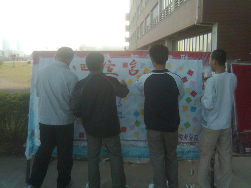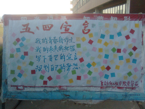 5月4日,自动化工程学院爱馨苑为弘扬五四精神,特举办了“五四宣言”活动。全校同学踊跃参加,纷纷将自己的“五四宣言”写在彩色卡片上,并贴在宣传板上。活动得到全校同学的热烈响应,同学们争先恐后地将自己的五四宣言贴满了宣传板。五颜六色的卡片上承载着当代大学生的斗志,决心,更承载着对我们伟大祖国新时代的希望。