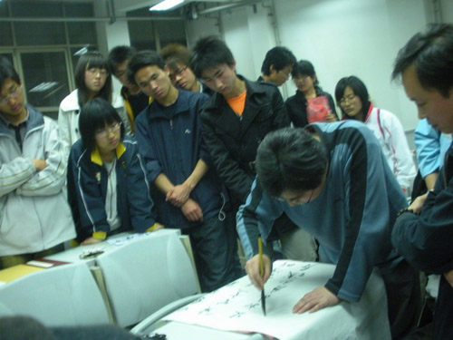 大赛尾声,王海涛老先生的两幅书法作品被展出供大家观摩,随后高老师和赵老师兴致高涨,为同学们现场展示了他们的行书和隶书书法,同学们争先观看,两位先生在书写示范的过程中不时停笔教同学们如何恰当使用书法技巧、并对同学们今后的书法练习提出建议。