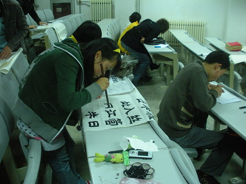 4月28日,由商学院学生会宣传部举办的三笔字大赛在二教阶103室拉开帷幕。商学院、艺术学院、经贸学院等十个学院的队伍参加了本次大赛。担任此次比赛评委的是:中国书画研究院理事高勇,中国书法研究院艺术委员会会员、青岛开发区书法家协会副秘书长赵远军,民间艺术家王海涛,以及商学院团总支书记任孔冰老师。