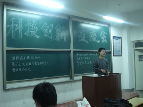 本次交流会旨在为进一步加深同学们对科技创新的认识,激发同学们科技创新的浓厚兴趣。交流会围绕“道路违章检测系统”“智能公交系统”等六个项目展开。每个项目成一组,项目制作者用幻灯片从原理开始细心的做了讲解,同学们根据自己关注的不同侧重点,分别听取了不同项目的讲解。在各项目介绍完毕之后,与会同学纷纷发表自己的意见建议,随后大家就学习经验和专业认识做了相互交流。
