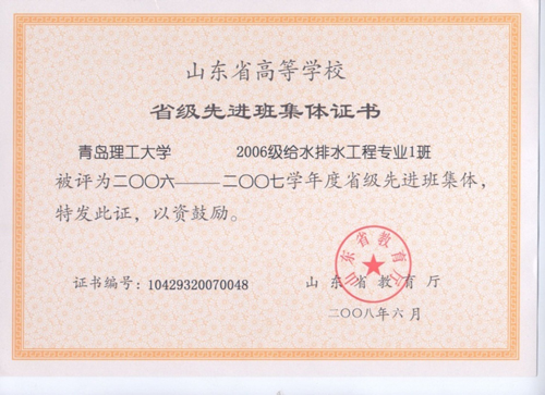 2008年6月,环境学院给排水061班被评为“省级先进班集体”,虽然刚刚是大三,但是在此荣誉获得之前,班级已先后荣获“早操先进班”、“晨读先进班” 、“学习优胜班” 、“优良学风班” 、“校级优良学风标兵班”、“最佳团日活动一等奖”等称号。给排水061班从入学初就一直把“上善若水,水行天下”作为班训,因为他们懂得水的智慧!他们相信:风华正当茂,向阳发奋正当时,前程无限好,月圆缺,光流转,天道亦酬勤!