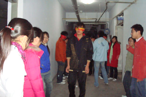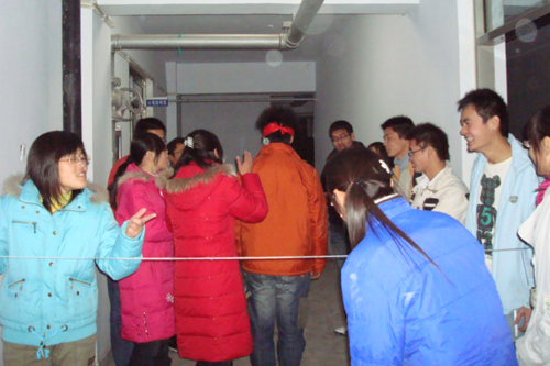 活动的开始,是由参与者围成一圈进行的自我介绍。随后,同学们要在纸上写下自己记住的人名以及在规定时间内按出生日期顺序重排一圈。这么具有创意的一个步骤让同学们体会到了在人际交往中迅速准确地记住他人的个人信息的重要性。接下来的第一个游戏是“踩报纸”,游戏要求四个人同时站在报纸上,而随着游戏的推进,报纸会被折的越来越小,这就考验了同学们彼此的协调合作能力。第二个游戏就是”蒙眼过线”,顾名思义,就是蒙上眼睛避开拉起来的线。游戏中一男一女分为一组,男同学被蒙上眼睛,然后听从女同学的指挥行动。而现实中线的存在与否是随机决定的,但女同学必须按存在线下指令。这个游戏启迪了大家,生活中许多所谓的困难其实不存在的,只要我们彼此信任,同心协力,就会发现成功很简单。