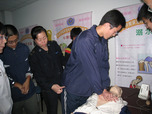 下午两点半,参加此次活动的40多位同学在工作人员的统一安排下开始参观学习。专业医生首先给大家介绍了相关的理论知识,列举了很多事例。医生着重给同学们介绍了心肺复苏术,包括抢救时的注意事项和抢救技巧等,并为大家演示了心肺复苏术的主要过程。在了解了相关理论知识后,同学们又进行了亲身实践,用刚刚学到的知识与技巧为假人模具做了一次心肺复苏术。