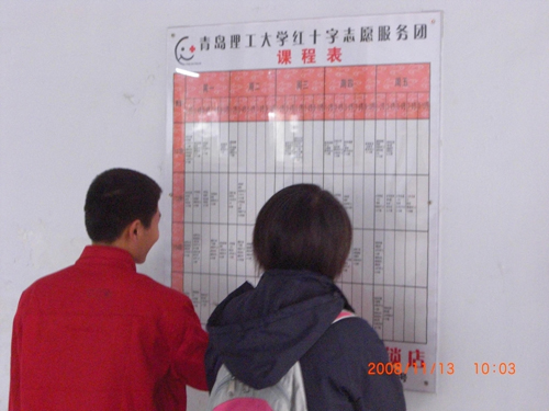 在安装的时候,外语学院一位同学仔细的查看了课表,并评价说,“想法很不错,挺为同学着想的,非常感谢红十字志愿服务团的志愿者们想同学们之所想、急同学们之所急”。
