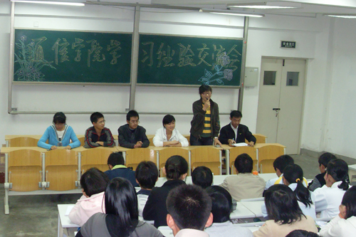 08新生入校已有两个月的时间,他们对崭新的大学生活既有了一定的切身的体会也产生了不少的困惑。为帮助新生尽快更好地适应大学的学习生活,加深对专业学习的了解,为四年的学习生活提前做好规划,在辅导员薛腾飞老师精心安排和学术部的积极筹办下,通信学院学习经验交流会于11月3日晚在阶教203成功召开,08级全体同学参加了本次会议。