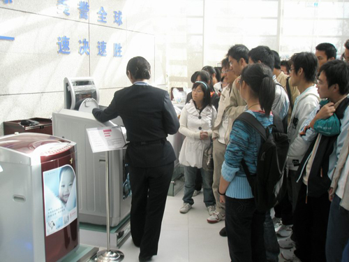 在讲解员的细致讲解下,同学们饶有兴趣的依次参观了拥有前沿科技、极富人文关怀、契合绿色环保理念的各类家电,例如太阳能节能板,双开门冰箱、无需洗衣粉的洗衣机等,还有厨房、浴室等整体家具用品以及海尔的黑色家电如电脑、电视等。随后参观了驻外工业园、办公楼的图片,以及富有纪念意义的当年砸冰箱的铁锤……