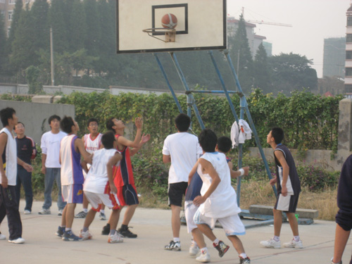 赛前20分钟,篮球场上已是人山人海,队员们在场上做准备活动,各班拉拉队员们在场边有节奏地为自己的班级呐喊助威,热情澎湃。