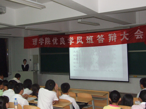 各代表队通过幻灯片展示了自己班级的学风创建、团日活动、课余生活及本学期的创建目标等,并对评委们提出的问题分别进行了回答。最终经过评选,电子061、数学061、计科061、计科071、数学071被评为优良学风班。