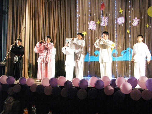 夺目的灯光预示着今夜的不凡,开场大屏幕上记录着同学们从黄岛到四方的点点滴滴,向人们呈现“希望是梦的彼岸,四方是梦的故乡。”随后,晚会在一段精彩的轮滑表演中拉开银幕,“情歌王子”曹宇的一首老歌《right here waiting》把现场的气氛提升了一个高度,接着深情的独唱《城里的月光》和幽默的话剧《尤里的复仇》更是让人感受到了两种不同的艺术气息;精彩的《服装走秀》和动人的《遇见》让现场的观众从视觉和听觉上都感到青春的活力;跆拳道和中国武术的表演相继而出把晚会推向了高潮,表演者的每一个动作,每一个姿势都博得台下观众的热烈掌声。在节目表演之余,晚会还设计了两个现场互动环节,《盲人之路》环节充分向同学们表示,世界需要合作,更需要爱。《携耳转转转》更是锻炼了选手的自我独立能力和自我控制能力。现场的同学们都踊跃参加,现场显得格外热烈、和谐。最后由四个学院代表组成的合唱团为大家带来了晚会的主题曲《我们是一家人》,在激情的旋律和热烈的掌声中晚会落下帷幕。