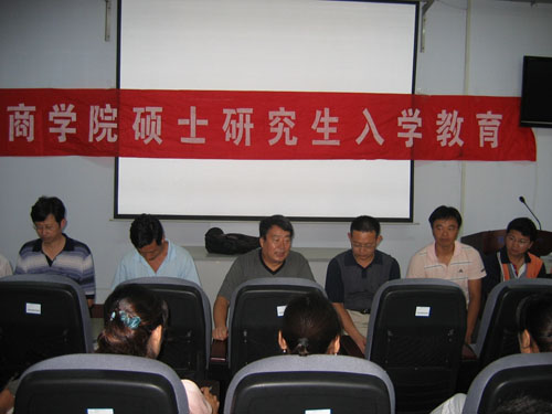 8月27日上午,商学院08级硕士研究生入学教育在商务与管理实践中心举行。商学院主要领导、部分硕士生导师和08级新入学的硕士研究生参加,分管研究生工作的杨成文副院长主持了本次会议。