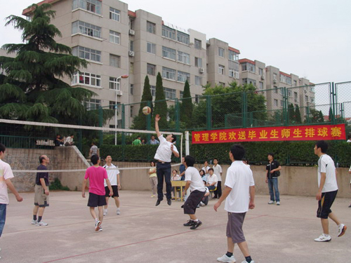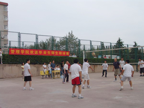 6月24日下午,管理学院教工男子排球队与即将毕业的2004级学生打了一场别开生面的排球赛。