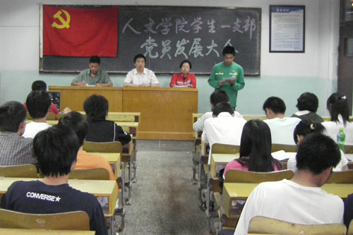 大会由张平老师主持。首先进行了预备党员发展议程,由申请入党的同学向大会宣读入党志愿书,向大会介绍了自己的政治思想、学习、社会工作、生活等各方面情况,党支部再汇报对发展对象的综合审查意见,然后由入党介绍人介绍了对发展对象培养考察情况,接着现场的党员进行发言讨论,最后由正式党员进行投票表决。转正的预备党员向大会宣读转正申请书,
