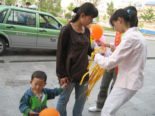 此次活动的目的是让代表着为地震灾区人民祈福的黄丝带飘满全城,我们的志愿者负责向路人发放黄丝带,系在他们的手腕上,同时发一张介绍黄丝带含义的小卡片,并代灾区人民向他们致谢。此外,我们还将黄丝带绑在路人的车上,希望大家的祈福能飘到更远的地方。