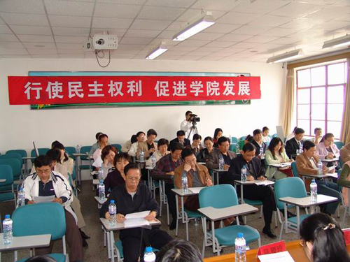 学校工会主席李选民致词。他首先对人文社科学院教代会的召开表示了热烈的祝贺,他认为人文社科学院在教职工民主建设过程中做了大量卓有成效的工作,取得了显著成绩,这次大会的召开体现了学院坚持以人为本的理念以及科学的发展观,必将极大的推动学院的发展建设进程,而这次大会也将开成是求真务实的大会,大会决议对学院乃至学校的发展都将起到巨大的推进作用。大会第三项,由学院院长谭业庭做工作总结报告和三年规划报告。谭院长做了题为“凝心聚力,真抓实干,推动学院各项工作又好又快发展”的学院工作报告。他首先对07年工作进行了回顾,指出学院进一步加强了制度建设,学科建设,实施三大战略,抓好五项建设,打造六大品牌,以评促建,巩固评估成果,加强学院学风建设和师资队伍建设,提高教师的教学水平和质量;初步形成了社工和广告的专业特色,有利的促进学生素质的提高;凝练了学院“养天地正气,法古今完人”的院训等。同时谭院长又作了学院三年规划报告,报告提出学院办学的基本思路:以科技发展为纲领,以人才培养为目标,以教育教学为生命,巩固评估成果,进一步推进教育教学改革,实施三大战略,抓好五项建设,打造六大品牌,实施人才兴院战略,提高学院师资力量,加强学生人文素质培养,形成浓厚的学风,增强学生实践能力,促进学生全面提高。大会第四项,由副院长任颖栀做了“学院绩效津贴实施办法”说明。任院长详细的介绍了分配方案的指导思想、方案实施原则以及计算方法。随后全体代表对“学院绩效津贴实施办法”进行了投票表决,表决结果通过了“学院绩效津贴实施办法”。同时,教职工代表举手表决通过了学院修改后的三个“学院教学管理规章制度”和通过了谭院长所作的工作报告、学院三年规划报告。最后王众臣书记致闭幕辞。
