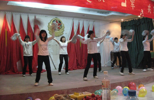 晚上,“迎奥运庆五一、军民共建大联欢”晚会在团岛官兵培训基地举行。同学们和部队官兵表演的歌舞、啦啦操节目博得掌声阵阵、喝采声声,学生官兵搭档的“三足运气球”游戏更是妙趣横生,一首全场激昂合唱的《歌唱祖国》把晚会气氛推向高潮。