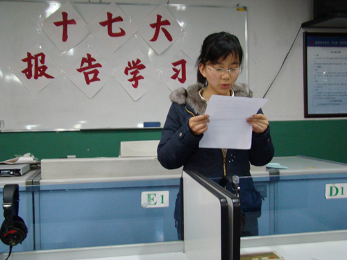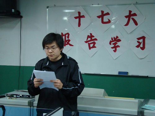 各班级结合专业的特点,通过组织学习外文版十七大报告、“十七大”相关知识问答、开展主题团日活动、交流学习心得等活动,在学院团员青年范围内营造出全面学习宣传和贯彻落实十七大精神的良好氛围 。特别是在新颖的外文版十七报告的学习中,同学们表现出极大的学习热情。