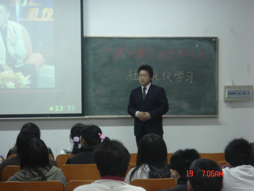 宣讲会上,首先播放了人民大学金正昆教授的视频,为全体同学讲述了关于称呼、自我介绍和介绍他人的基本礼仪规范,并展示了大学生在人际交往过程中的技巧;随后广天公司总经理孙汉付先生为同学们介绍了一些生活小常识,还以游戏的方式让大家切实体会到了团结协作的必要性和重要性。