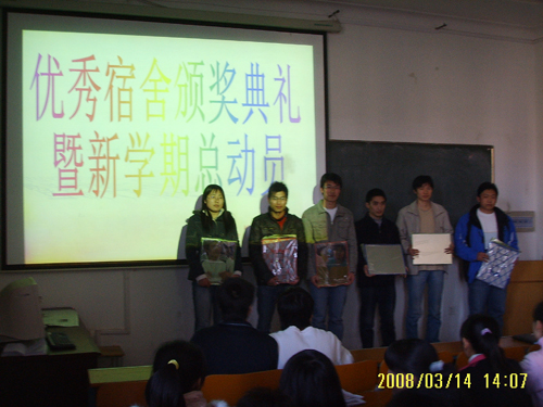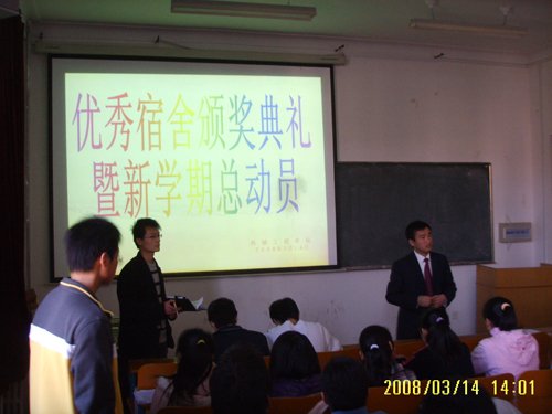 3月14日下午,机械学院在3#308室召开优秀宿舍颁奖典礼。此次活动由机械学院生活部开展,参加此次颁奖典礼的为机械学院06级各个寝室宿舍长及优秀宿舍全体成员,团总支书记贺治成、辅导员柳超老师出席了此次活动。