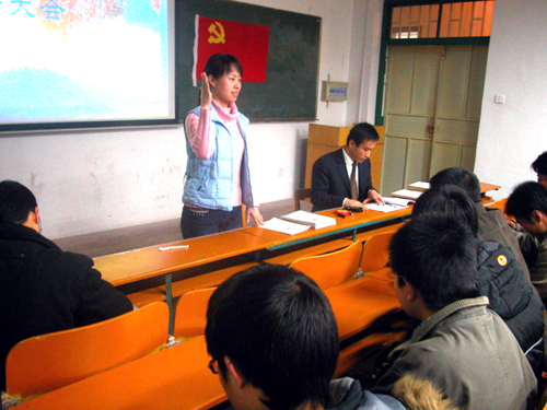 随后,贺治成老师代表学生党支部对15名党员发展对象提出要求:1、继续认真学习贯彻党章,深化对邓小平理论和“三个代表”重要思想的理解,坚定理想坚持党的宗旨不动摇;2、在以后的学习、工作中,戒骄戒躁,积极进取,形成刻苦钻研的进取精神,党员是我院学生的形象,更要严格要求自己,工作积极主动,乐于奉献,终身学习,展现我学院精神风貌;3、树立团结奋斗的精神和集体主义观念,积极参加各项集体活动,主动承担班级各项工作,团结协作,积极完成各项任务;4、形成良好的文明修养,文明不是体现在学历层次,而是体现在日常行为方面,待人真诚,言谈谦逊,举止文明,诚实守信,为人和善等,是对每一位党员的要求。