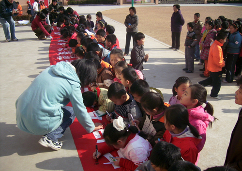 日前,由环境学院举办的“环保文化节”系列活动之“携手环保,走进校园”签名活动在青岛市大路小学举行。
