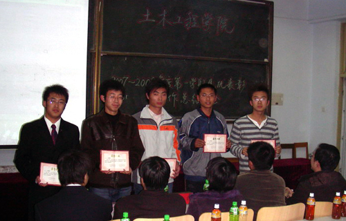 12月7日晚,土木工程学院2007~2008年度第一学期先优表彰暨工作总结大会在一教506室圆满结束。院党总支副书记宋玲、校团委孙匡正老师、团总支书记高洁、辅导员邵先锋和张立伟等老师到会。