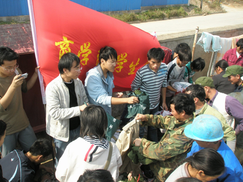 11:30,商学院学生会实践部和爱心社同学,携带着经过2天收集整理的2007级新生的军训服装从学校出发向福瀛集团民工宿舍走去。同学们一到,便受到了民工们的热情欢迎,在简要介绍了此行的目的后,同学们仔细认真地为民工挑选适合他们尺寸的衣物,民工们领取衣物时,秩序良好。民工方的负责人,来自甘肃宁夏的卢维昌,代表工地所有民工向同学们表示感谢。