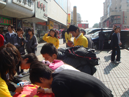 活动第一个环节中,为了互相交流互相合作,从全体志愿者中抽出一部分,按不同学校分为八个小组,分别负责威海路天桥的八个桥梯,清除垃圾广告。一部分志愿者不时地穿插在行走的人群中,向行人宣传保护环境的意义,倡导市民为支持绿色奥运签名。第三个小组在一条横幅前,以饱满的热情为市民宣讲绿色奥运知识,组织市民签名。