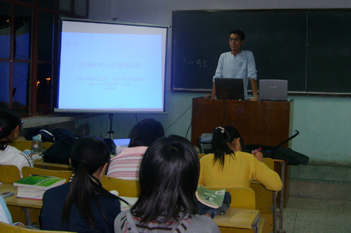 在商学院党总支办公室及学院办公室老师的大力帮助下,在市场营销协会负责同学精心准备,管理学系列视频讲座第一篇成功开讲。商学院市场营销协会会长——05级市场营销专业学生刘川川利用所学专业知识,自己制作了POWERPOINT课件,采用了实际案例加讨论总结的西方教学模式,从大家接触最多的广告开篇,介绍市场营销专业知识。讲座期间播放了许多视频和平面广告,如汽车、水果、饮料等,并向同学们介绍了一些优秀的广告文案。