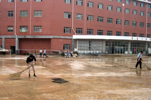 在总支书记彭介寿的带领下,职工们有的拿着铁锹,有的拿着水枪,有的拿着扫把,有的推车,一个个干得热火朝天、汗流浃背。大家尽管累得腰酸背疼、满头大汗、衣裤湿透却毫无怨言。劳动中,李东副校长也来到了现场,给予充分肯定和赞许。经过同志们将近3个小时的共同努力,庭院上的垃圾和淤泥基本上被清除干净,庭院焕然一新。