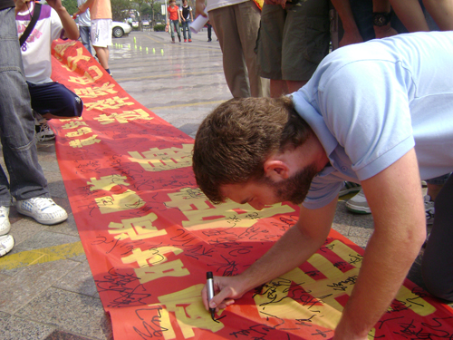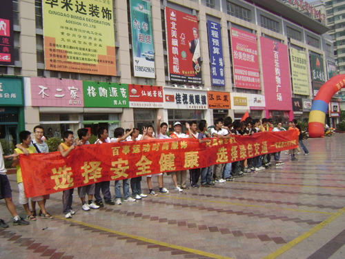 志愿者在“世纪商城”、瑞泰利群、佳世客前面向司机朋友们纷发无车日宣传单——《致各私家车主的一封信》,呼吁各私家车主配合好城市公共交通周活动,提高环保、安全意识,举行了“无车日万人大签名”活动,并做了轮滑表演。活动现场气氛异常热烈,市民纷纷响应,有些外国朋友也热情地支持此项活动。