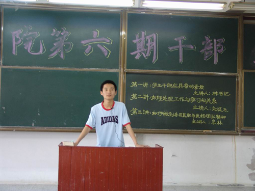 第二讲则是由刘廷飞同学结合自己在处理学习和工作关系中的经验和体会给同学们作了讲座,为同学们在实际学生工作中遇到的问题和疑惑作了解答,使同学们在学生工作实践方面有了很大提高。最后刘廷飞送给大家的“成功需要不断的忍耐,我们始终要以莫大的耐心和努力去等待成功”,极大地激励了同学们。
