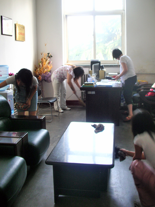 在学生一支部老师的带领下,一支部所有的党员同学发扬不怕苦不怕累的党员精神,对艺术学院教室、办公室及周边环境进行了彻底的打扫。在活动现场,有的同学在擦拭玻璃,有的在收拾沉静了好久的书刊,有的在帮老师整理资料……因为天气炎热,同学们的衣服被汗水湿透了,脸上也不知什么时候抹上了道道灰迹,但他们依然认真打扫着每一个角落。一位同学擦着汗水说:“衣服脏了没关系,咱们的学习环境变好了,心里高兴!”
