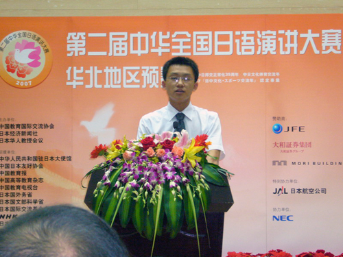 “第二届中华全国日语演讲大赛”是由中国教育国际交流协会与日本华人教授会、日本经济新闻社、日本电通株式会社等共同主办,旨在纪念中日邦交正常化35周年,进一步增进中日两国人民之间的友谊、加深互相了解、提高日语学习者学习日语的热情、促进日语水平的提高。本次大赛是一次规模空前的日语演讲比赛,覆盖全国29个省市和地区。其中华北地区的预赛,囊括了山东、山西、河北、内蒙古、天津的26所高校的选手。