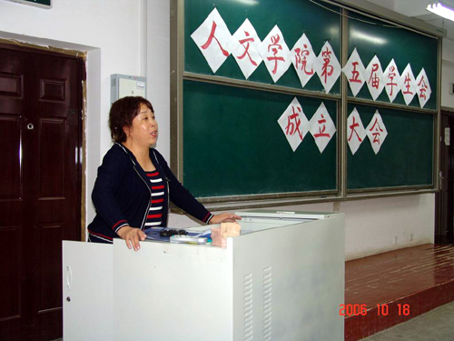 会议开始前放映了人文学院学生会各项工作成果课件展示,课件由发展历史篇、特色活动篇和人文精神篇三部分组成。宣传片围绕“彰显人文特色,打造人文品牌”的发展目标,详细的介绍了学生会各部门职能以及社会实践活动中所取得的优异成绩。随后,由东忠方老师宣读《人文与社会科学学院第五届学生会主要干部名单》;林桂梅副书记致词。林书记首先对新一届学生会的成立和新成员的加入表示热烈的祝贺,并感谢兄弟学院对人文学院学生会工作的大力支持,并对学生会在过去的一年里所取得的成绩给予肯定和鼓励,同时向全体学生干部提出“武装头脑,完善自我”既应做到“12345”和“刻苦学习,勇挑重担”的希望要求。“一”,就是要一心一意为学生服务,一切为了学生,一切服务学生。“二”,就是指毛泽东同志提出胡锦涛同志重申的“两个务必”,务必保持谦虚谨慎不骄不躁的作风,务必保持艰苦奋斗的作风。吃苦在前,享受在后,“三”,就是要贯彻“三个代表”重要思想,做到“三个代表”在我心目中,“三个代表”在我行动中。“四”,就是江泽民同志在北大百周年校庆上提出的“四个统一”,也就是始终坚持学习科学文化知识和加强思想道德修养的统一,坚持学习书本知识和投身社会实践的统一,坚持实现自身价值和服务祖国人民的统一,坚持树立崇高远大理想和进行艰苦奋斗的统一。“五”,就是要“五学会”,学会做人,学会做事,学会生活,学会求知,学会创造。