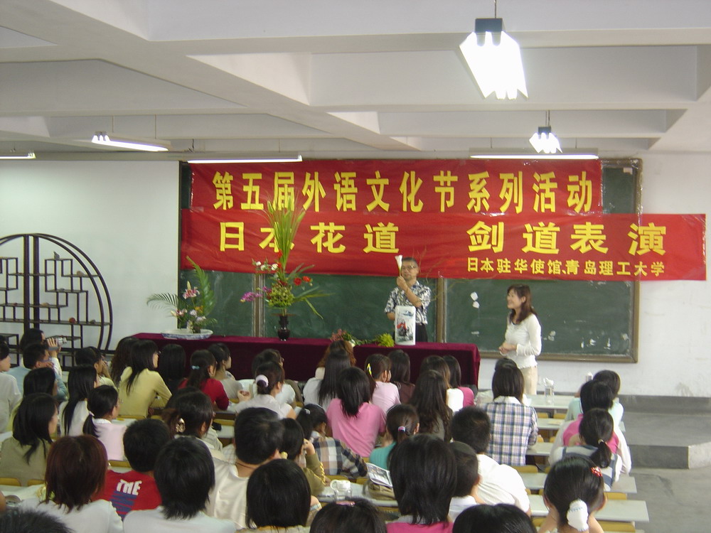 上午,驻华文化交流大使大坪先生在1号教学楼300阶为同学们表演了日本传统插花艺术——花道。首先,大坪先生通过精美的幻灯片娓娓讲述了花道的渊源、现代花道的发展以及花道发展的现状,使同学们在感官上对日本插花艺术有了初步了解。之后,大坪先生现场表演插花,顷刻,三组风格迥异、巧夺天工的插花作品便呈现在大家眼前。一盆“群芳争艳”在色彩和造型上给人以强烈的视觉感受;一组“青岛印象”在各种饰物和植物的巧妙搭配下显示了青岛给这位国际艺术大师所留下的魅力温馨的印象;最后一组是大坪先生在衣架的基础上构思所作,它层次分明、设计独特,更是体现了艺术家惊人的想象力和高超的创造力,赢得了同学们的阵阵掌声。