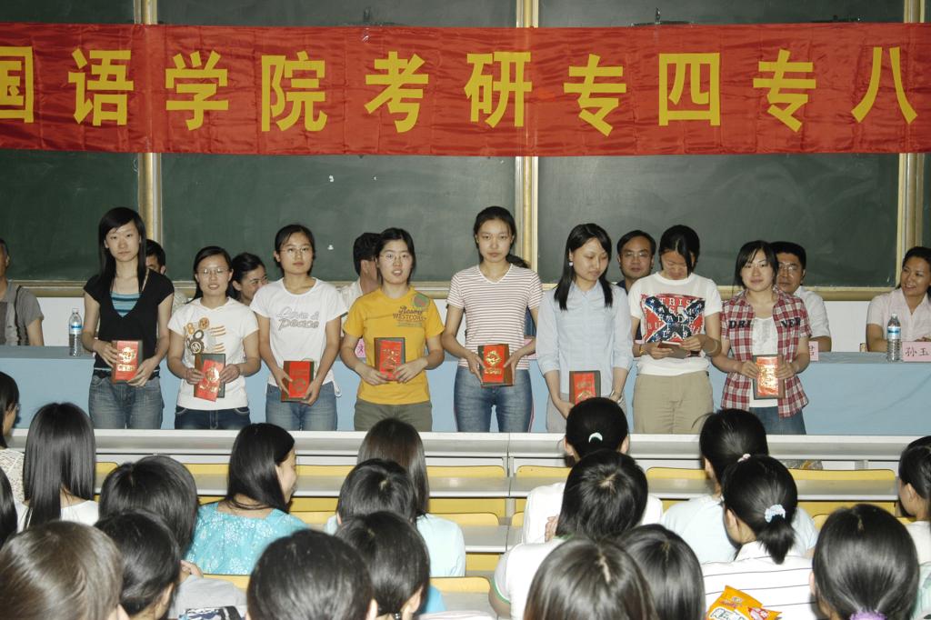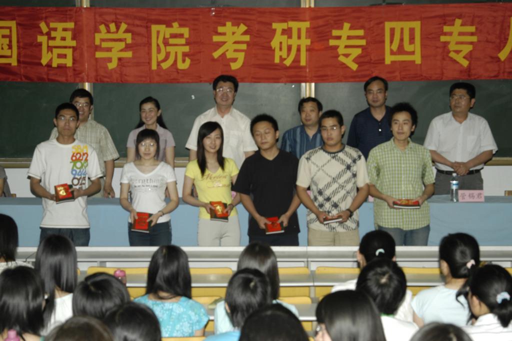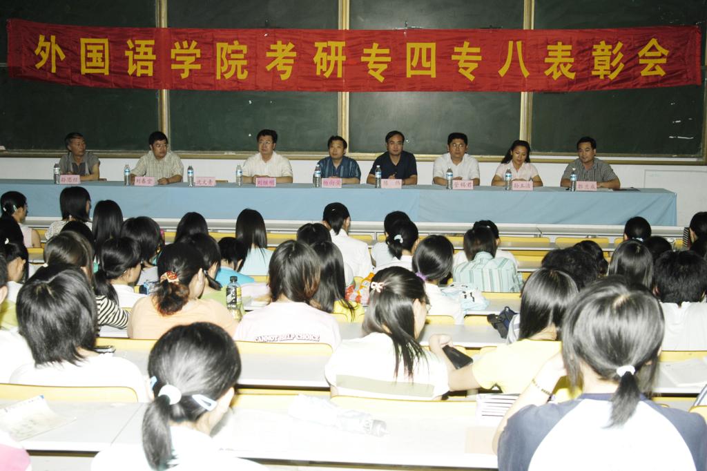 6月21日下午,外国语学院在200阶梯教室隆重举行考研、专四、专八表彰大会,表彰2006年考取研究生和考研成绩达到国家录取线的学生,及2005年英语、日语专业四级、2006年英语专业八级考试成绩突出的个人和班级。