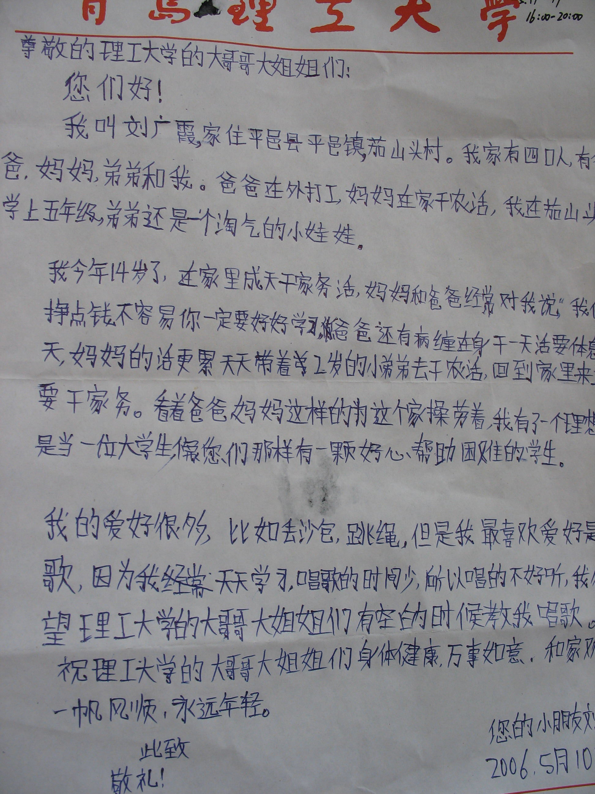 山区孩子写给365完美学生的一封信