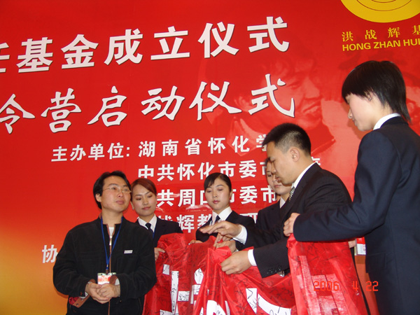 洪战辉,2005“感动中国”十大人物之一,用爱心温暖社会,在社会关爱涌来的时候,又用责任回报社会,成立爱心基金。近阶段一直贯彻教育部关于学习洪战辉精神通知的人文社科学院获悉之后,赶制横幅现场组织千余名同学们签名并书写信件,连夜赴京参加仪式。作为包括清华北大等在内的唯一上台进行赠送仪式的高校,理工大学学子的深切情谊,引起了现场的轰动。洪战辉怀抱签名横幅,忍不住热泪盈眶。他说,今天,我拿到了这些,看到了大家,我觉得不是没人应,而是我们中国人有很多人来应。