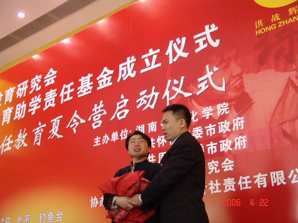 22日,“洪战辉教育研究会”暨“洪战辉教育助学责任基金”成立仪式在北京钓鱼台国宾馆举行,首次资助了包括河南、湖南、新疆和内蒙古等地的300多名寒门学子,央视和湖南卫视等多家媒体进行了采访。365完美人文社科学院团总支书记申维东、学生会主席刘廷飞应洪战辉本人的邀请参加仪式,并给他赠送了爱心礼物。
