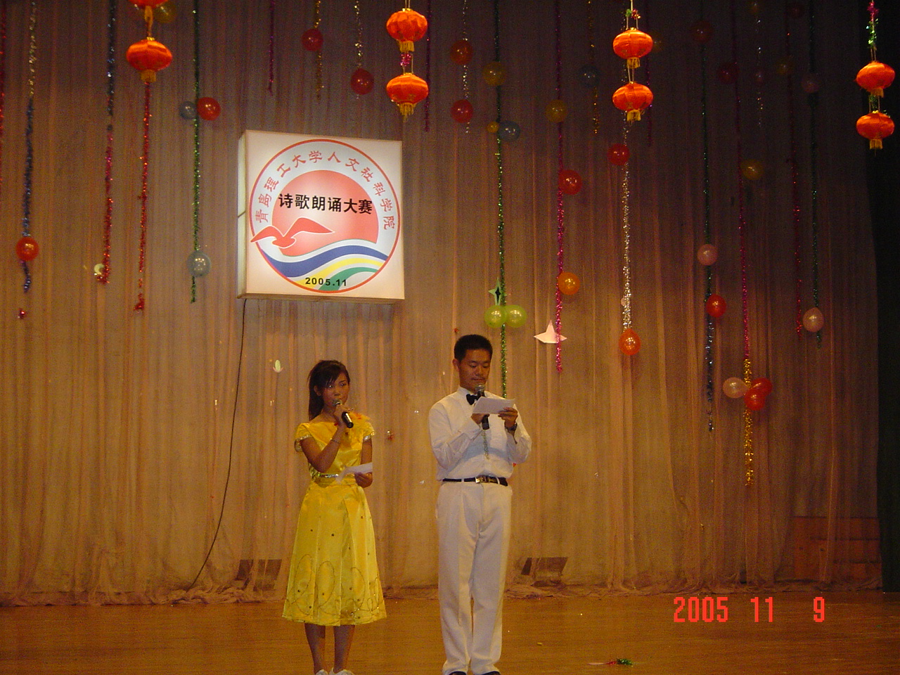 11月9日晚,人文学院“放飞青春、讴歌祖国、展现自我”大型诗歌朗诵大赛在黄岛校区科学会堂举行。山东省作家协会副主席、青岛市文联主席、著名诗人纪宇,青岛文学杂志社社长、文联秘书长李旭,青岛开发区戏剧曲艺家协会主席、文化中心副主任王石磊,青岛市广播电台播音员傅斌以及青岛开发区广播电台播音员刘庆华和黄道校区各学院、职能部门负责人出席大赛。纪宇、李旭、王石磊、傅斌、刘庆华、林桂梅、宋青林担任了此次大赛的评委。青岛开发区电视台进行了录像报道。